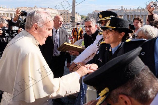 La imagen muestra al Papa Francisco recibiendo el cuadro que realizó el Comisario Inspector Edgar Alias de la Departamental Ischilín. La delegación de la Policía de la Provincia de Corboba fue recibida hoy por su santidad y ya se conocieron alguna fotos.