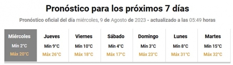 Si nos aventuramos a mirar hacia el futuro (bueno, los próximos 7 días), el pronóstico oficial nos tiene algunas sorpresas. Parece que el jueves está planeando vestirse más cálido, con temperaturas mínimas de 9°C y máximas de 26°C. ¡Eso suena como un día de primavera en pleno agosto!.