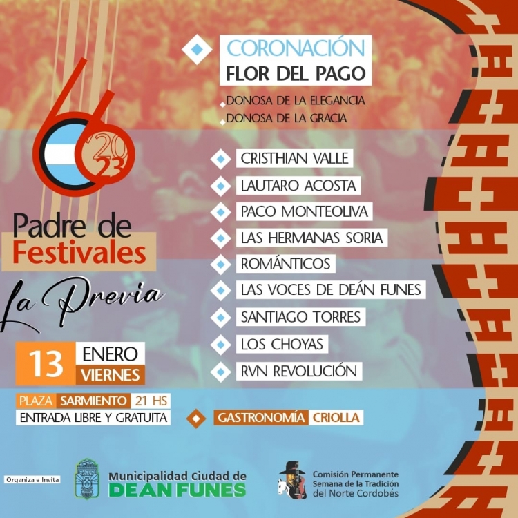 Además, la previa contará con la actuación de Cristhian Valle, Lautaro Acosta, Paco Monteoliva, Las hermanas Soria, Románticos, Las voces de Deán Funes, Santiago Torres, Los Choyas, Rvn Revolución.