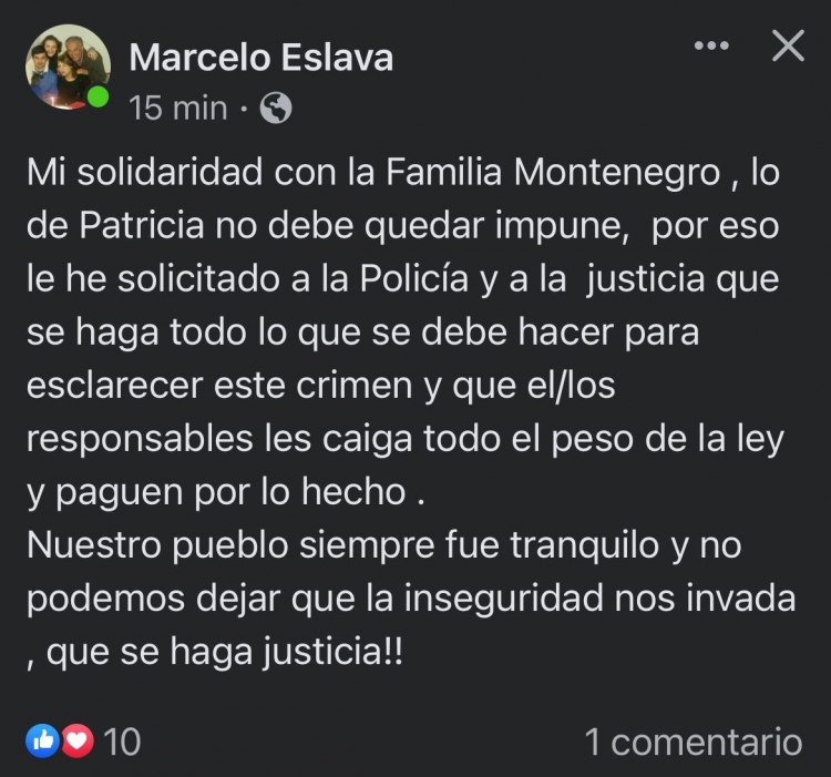 El intendente Marcelo Eslava, estuvo presente en la multitudinaria marcha. Además, en su cuenta de facebook realizó un pedido para la justicia.