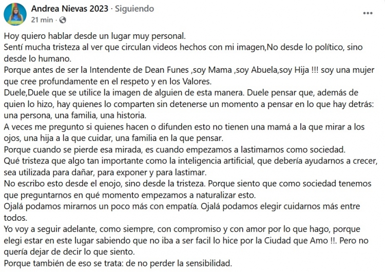 La intendenta de Deán Funes, Andrea Nievas, publicó en su cuenta de Facebook una carta abierta en la que expresa su profundo malestar al ser víctima de videos generados con inteligencia artificial.