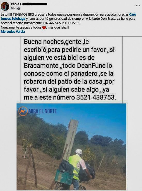 “Yo compartí la publicación y varios amigos me hablaron para que organizara una colecta, pero me llamó Caro Juncos (Solohaga) y me dijo que se iba a fijar si tenía una en condiciones y la donaba. Hace una hora se la llevamos y recién me escriben ofreciendo otra. Pero gracias a Dios ya está solucionado”, contó a Mira El Norte Paola G., la usuaria de Facebook que inició la buena acción.